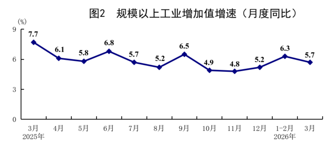 一季度,宇宙范围以上工业加多值同比增长6.1%,比上年四季度加速1.1个百分点。分三大门类看,采矿业加多值同比增长6.0%,制造业增长6.4%,电力、热力、燃气及水分娩和供应业增长4.3%。装备制造业加多值同比增长8.9%,高技艺制造业加多值增长12.5%,差异快于全部范围以上工业加多值2.8和6.4个百分点。分经济类型看,国有控股企业加多值同比增长4.8%;股份制企业增长6.6%,外商及港澳台投资企业增长3.9%;私营企业增长6.1%。分产物看,3D打印建筑、锂离子电板、工业机器东说念主产物产量同比差异增长54.0%、40.8%、33.2%。3月份,范围以上工业加多值同比增长5.7%,环比增长0.28%。3月份,制造业采购司理指数为50.4%,比上月上升1.4个百分点;企业分娩打算当作预期指数为53.4%。1—2月份,宇宙范围以上工业企业竣事利润总数10246亿元,同比增长15.2%。